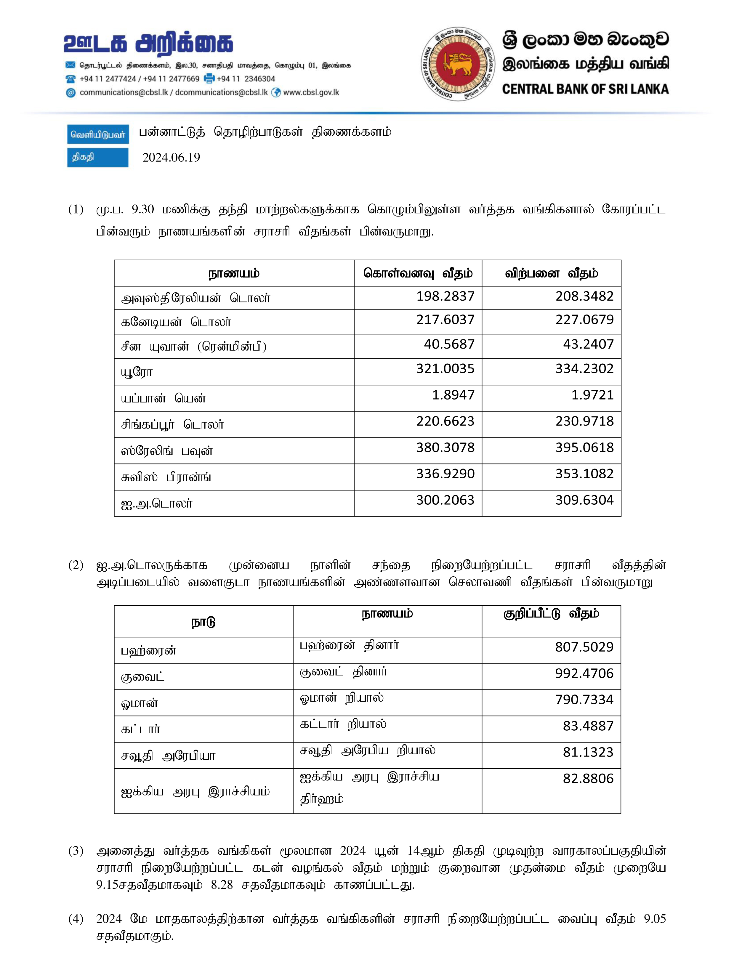 இலங்கை மத்திய வங்கி இன்று புதன்கிழமை (19) வெளியிட்டுள்ள நாணய மாற்று விகித அறிக்கையில் இந்த விடயம் தெரிவிக்கப்பட்டுள்ளது.