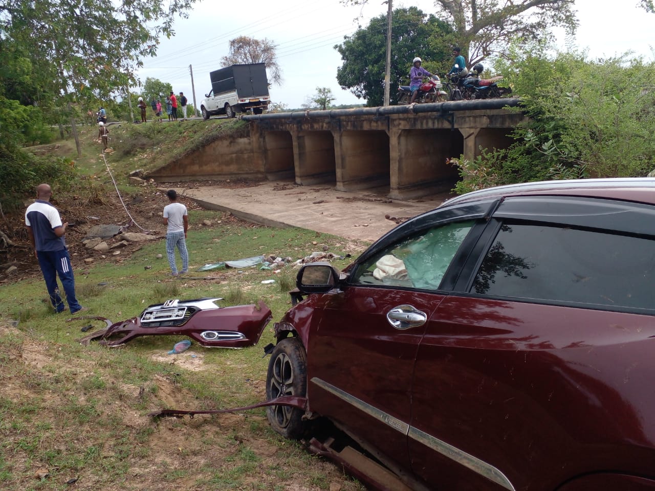 யாழ்ப்பாணம், பருத்தித்துறையைச் சேர்ந்த கணவன், மனைவி இருவரும் இரண்டு பிள்ளைகளுடன் மட்டக்களப்பு நோக்கி பயணிக்கையில் குறித்த கார் வேகக்கட்டுப்பாட்டை இழந்து பாதையை விட்டு விலகியதில் இவ்விபத்து இடம்பெற்றுள்ளதாக பொலிஸாரின் ஆரம்பக்கட்ட விசாரணையில் தெரியவந்துள்ளது. குறித்த விபத்தில் கணவன், மனைவி இருவரும் காயங்களின்றி உயிர் தப்பியுள்ளனர்.