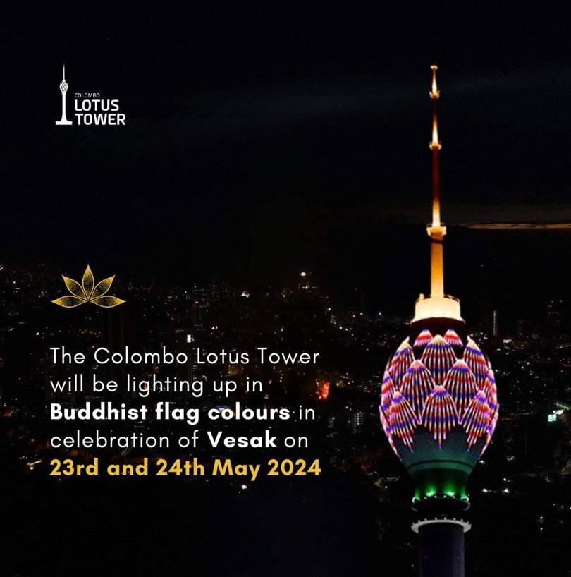 வெசாக் பௌர்ணமி தினத்தை முன்னிட்டு தாமரை கோபுரம் பௌத்த கொடியிலுள்ள வர்ணங்களில் ஒளிரும் என தாமரை கோபுர நிர்வாகம் தெரிவித்துள்ளது.